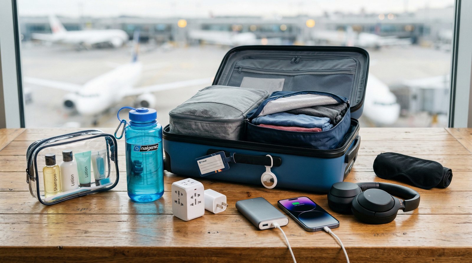 Add your empty water bottle, your sleep kit, and a luggage tracker, and you will be ready to go!
