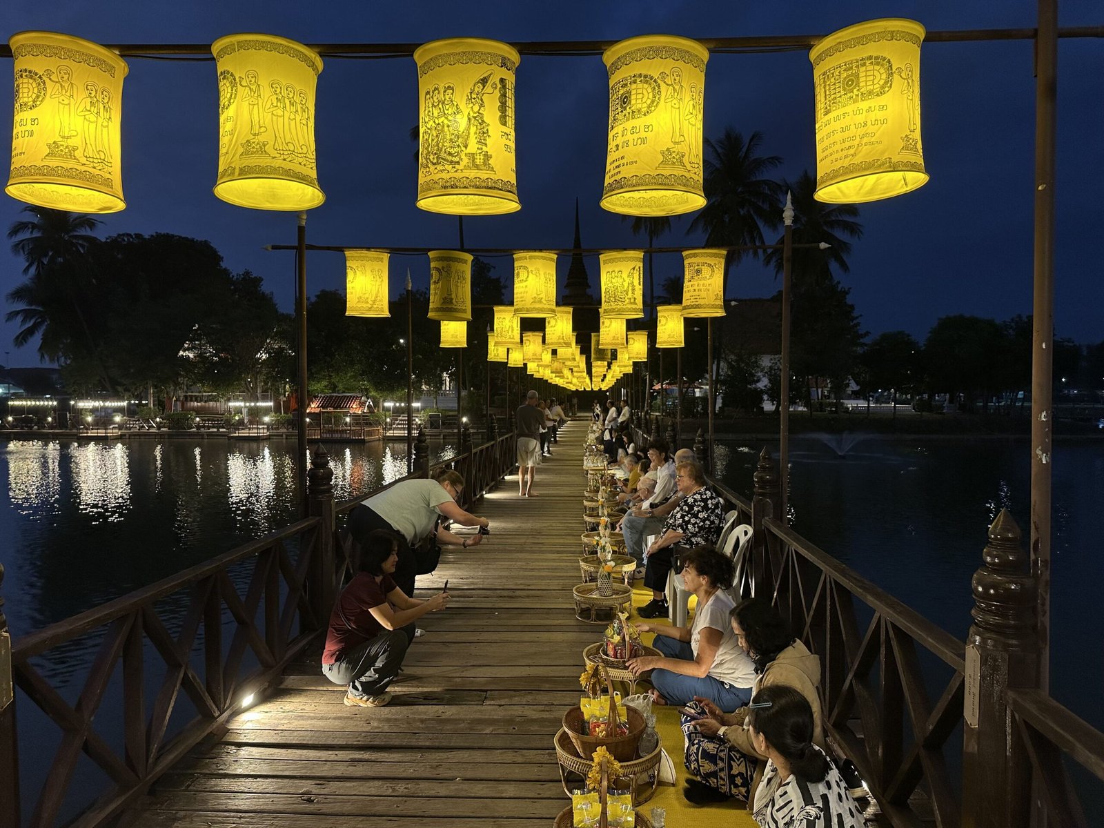 Begin your morning early just outside the main historical park at Wat Traphang Thong. This temple sits on a small island in a lotus pond. Around dawn, local monks walk across a wooden bridge to collect daily food offerings from the community. It is a quiet, deeply traditional Buddhist practice.